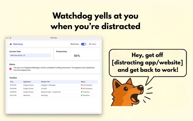 - Productivity Timeline – Review a running history of apps, window titles, and focus verdicts to spot distraction patterns.