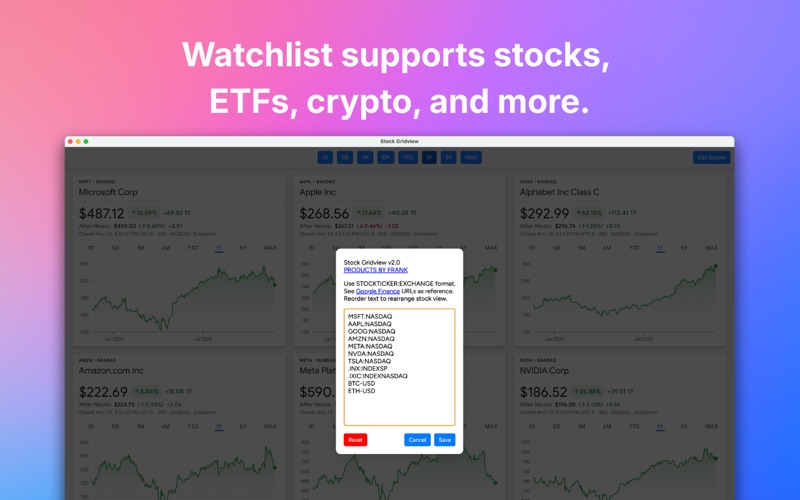 - Supports all Google Finance symbols including stocks, ETFs, mutual funds, cryptocurrencies, etc