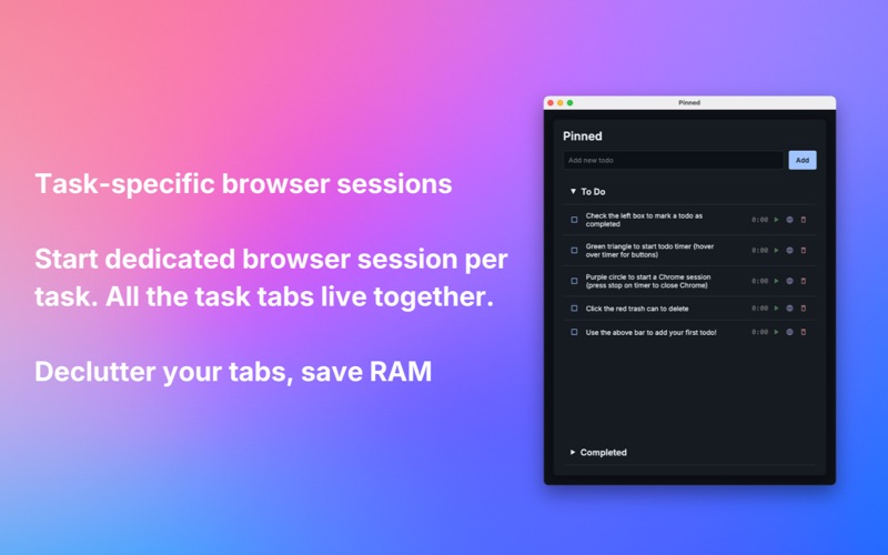 Then take it one step further: create task-specific browser sessions. Don’t get distracted or bogged down by your current tabs. Open a dedicated session for each task so all related tabs live together. Click 'Stop' or 'Mark as Done' and all the tabs close together.