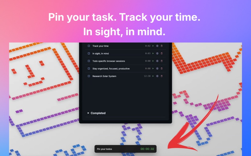 on top, so it never disappears behind windows, tabs, or videos. Automatic time tracking keeps you accountable.